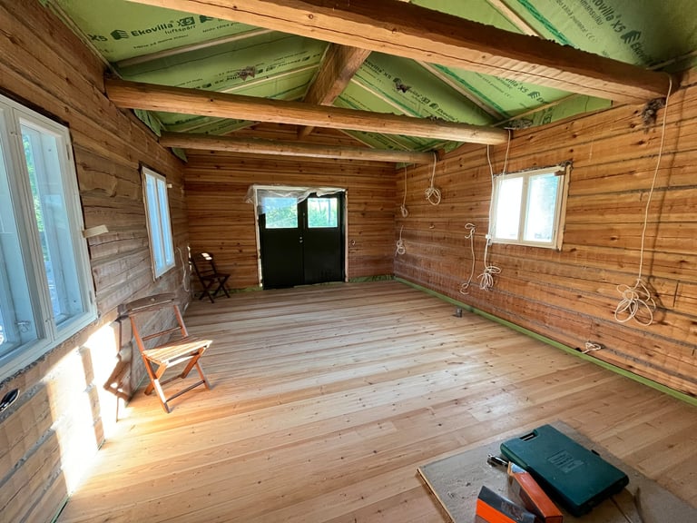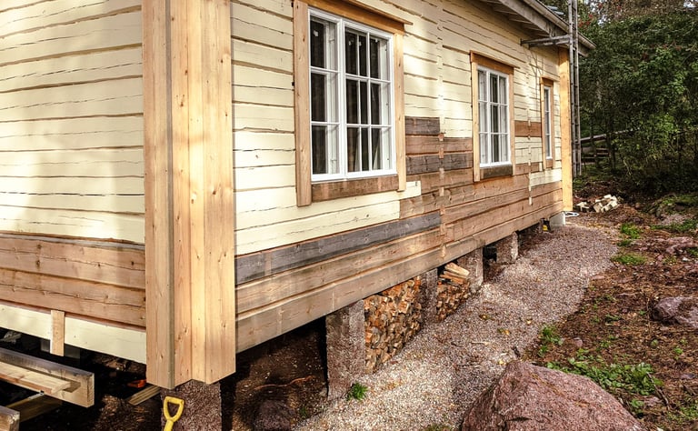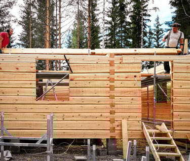 Hirsien välissä käytän vain luonnonmukaisia eristeitä kuten lampaanvillaa tai pellavaa. Näin saadaan aikaan hengittävä ja terveellinen rakenne.