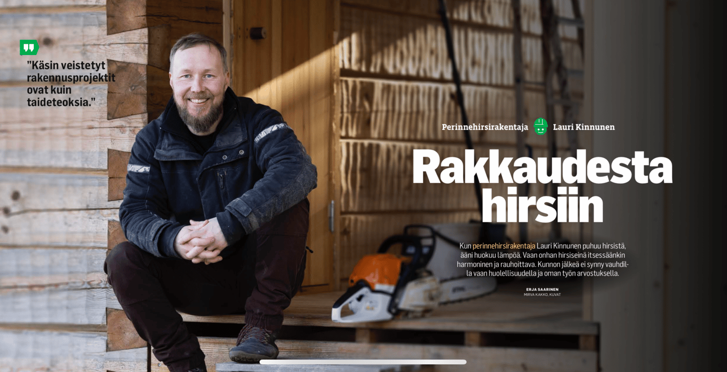 Minä Hirsi-Lauri, eli Lauri Kinnunen, olen ylpeä rakennuksista, joita olen saanut tehdä. Hyvin tehty työ tuottaa iloa ja on kunnia asia. Teen käsin veistettyjä hirsirakennuksia yli 20 vuoden kokemuksella.