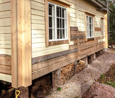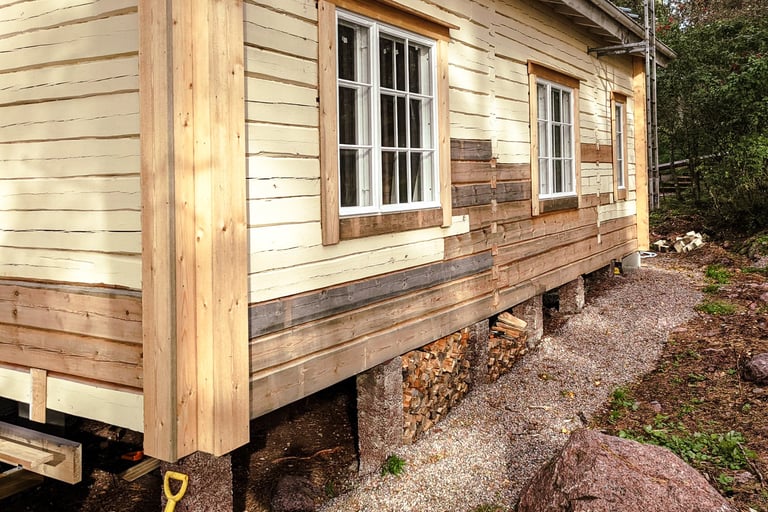 Alimmat hirret ovat tyypillisesti eniten sään aiheuttamalle kulumiselle alttiina. Ne ovatkin ensimmäinen osa, joka hirsirakenteesta tyypillisesti joudutaan korjaamaan. Teemme alimpien hirsien vaihtamistöitä, eli nk. kengitystä. Valmiista maalatusta tai käsitellystä pinnasta ei välttämättä edes huomaa, että alimmat hirret on vaihdettu.