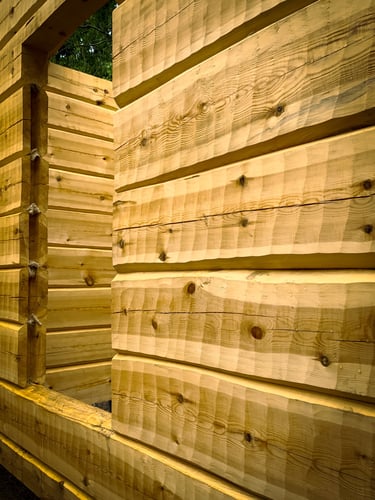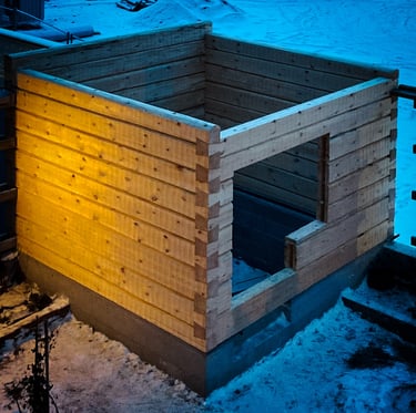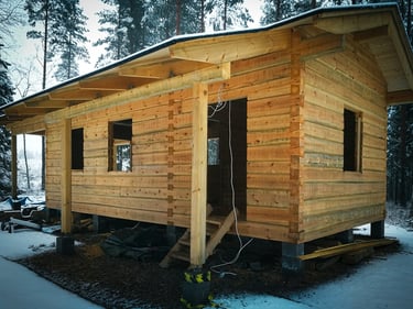 Käsinveistetty saunarakennus. Toteutimme hirsikehikon, perustukset, vesikaton ja lattianrungon.