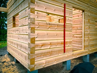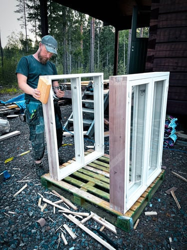 Hirsiosaan asennettiin puusepän tekemät ovet ja ikkunat.