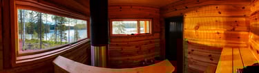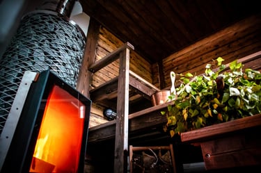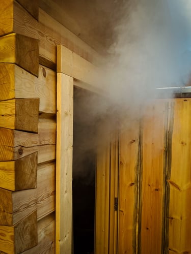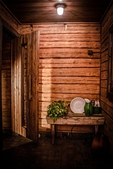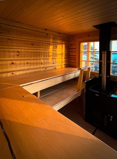 Sauna ja takkahuone käsinveistetystä hirrestä.