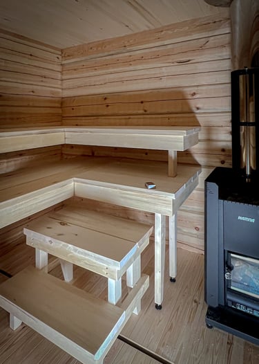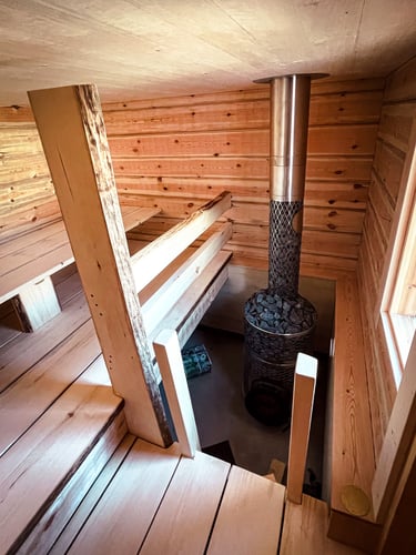 Saunaan tuli aitokiuas ja korkeat pylväslauteet. Saunan huonekorkeus on 2,7 metriä.