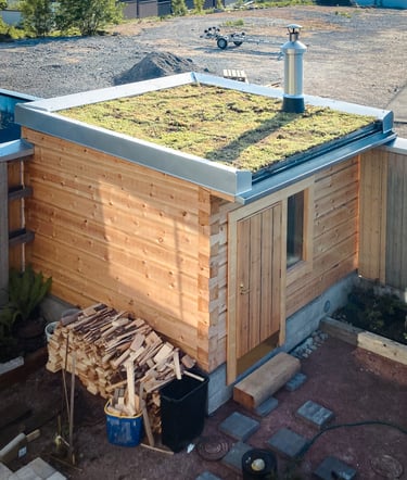Pieni maksaruohokattoinen saunarakennus. Teimme kaiken muun paitsi perustukset.