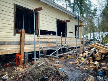 Kirkkonummelle laajennusosa 60-luvulla käsinveistetyn rakennuksen jatkoksi. Teimme veistotyön lisäksi rakennuksen täysin valmiiksi.